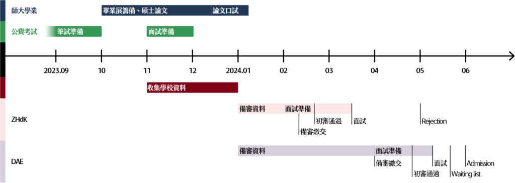 在2023交換結束前,我和The Basel School of Art and Design(瑞士西北應用科學與藝術大學下的巴塞爾藝術與設計學院,HGK)Digital Communication Environments(視覺溝通環境,IDCE)的系主任討論,獲得了可以在HGK就讀二年級並準備博士班申請的Offer。不過,由於在拿到正式的Admission前,任何的口頭約定都可能只是空談,同時也希望自己不要因為有了Offer而跳過申請國外碩士的歷程,所以同時準備了瑞士The Zurich University of Art(ZHdK) Interaction Design和荷蘭Design School of Eindhoven(DAE) Social Design兩間學校的碩士班申請。當時也有考慮申請芬蘭的Aalto University,不過申請時間太趕,放棄。