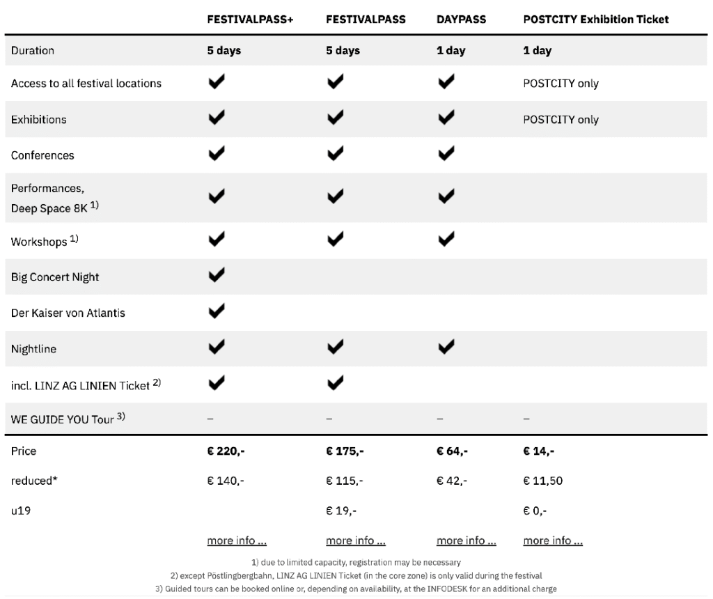 藝術節的票分為FESTIVALPASS+、FESTIVALPASS(全會期票)、DAYPASS(單日票)、POSTCITY Exhibition Ticket。官網能查看各種票卷的詳細參觀範圍。前兩種票包含展期五天Linz路面電車1至4號線的核心區域,及巴士12號,其他票卷需要另外購買Linz AG Linien的交通票。